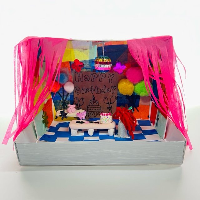 In this birthday party themed craft kit we will craft a mini party diorama complete with clay, tissue, streamers, and pom pom balloons that will remind us to be grateful for all the birthdays we get to celebrate with family and friends !